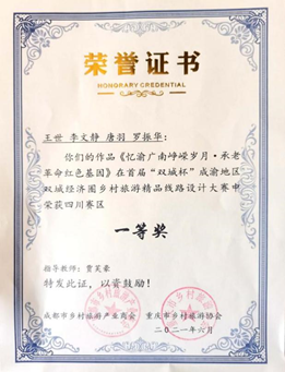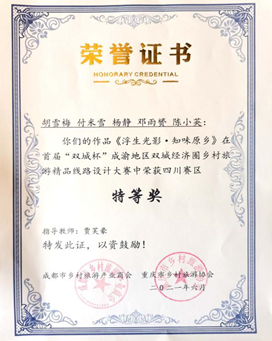 在初赛中,在我院旅游教研室贾芙豪老师的精心指导下,由王世、李文静、唐羽和罗振华4名同学组成的“赤火丹阳队”荣获四川赛区一等奖,由胡雪梅、付米雪、杨静、邓雨赟和陈小英5人组成的“蒹葭明月队”荣获四川赛区特等奖,他们所提交的作品《浮生光影·知味原乡》入围决赛,经过激烈的竞争,最终荣获总决赛二等奖。我院贾芙豪老师荣获“优秀指导教师”称号。