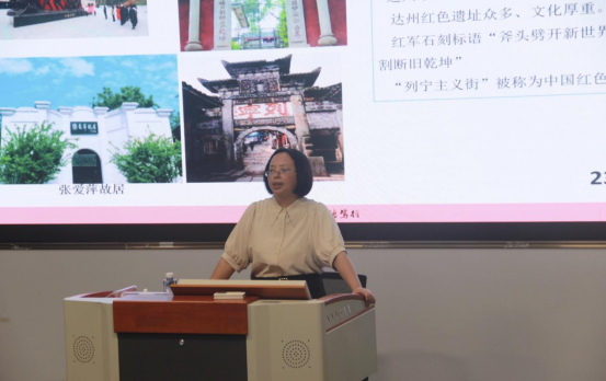 她讲道,达州古隶巴国,祖系賨人,渠县城坝遗址和宣汉罗家坝巴人文化遗址的发掘有力证明了达州是巴文化重要的承载地,且经史学专家证明,宣汉土家族是达州境内仅存的古巴人后裔。达州红色遗址众多、红色文化厚重,达州人民的血脉流淌着生生不息的红色基因。达州地方民俗文化熠熠生辉,元九登高节、巴山背儿歌、石桥火龙、安仁板凳龙、开江石工号子等非物质文化遗产数量众多。2019年达州评选的十大“巴文化·达州历史名人”分别为:鹖冠子、春申君、冯绲(gǔn)、王平、李雄、元稹、破山禅师、李长祥、唐甄、王万邦,既有文臣武将,又有文人骚客,对中华民族或达州的历史发展有突出贡献和推动作用。