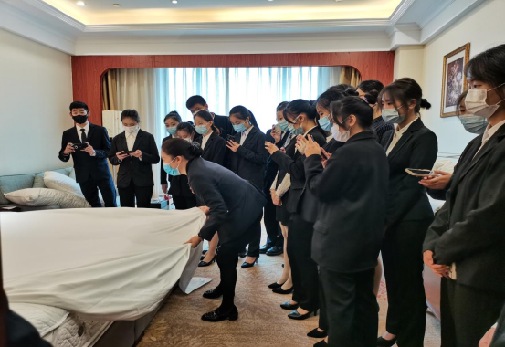 酒店技能大赛获奖者施经理还为同学们现场展示了一整套客房操作技能,让同学们学习到了标准的酒店客房服务操作流程。参观过程中,同学们都秉怀着求知求识的热忱,积极与工作人员进行交流学习,酒店工作人员对同学们的提问也进行了认真细致的讲解,使同学们在本次参观学习中以行促知、受益匪浅。