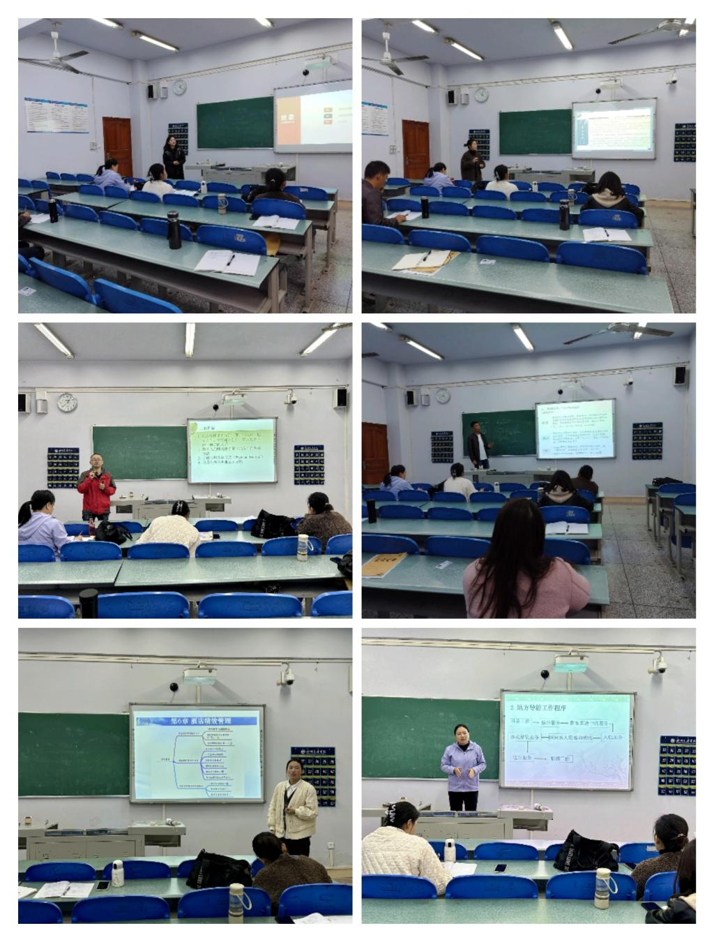 教研室听评课活动分为公开课展示和评课交流两部分。在公开课展示部分,陈国柱老师以《酒店管理信息系统》的接待入入住、曹娜老师以《导游业务》的地接导游工作程序、张晓老师以《酒店人力资源管理》的绩效管理、贾芙豪老师以《酒店管理概论》的期望理论、张旭源老师以旅游资源和卢双鹏老师以《前厅与客房管理》的超额预订为题分别进行课堂教学展示。
