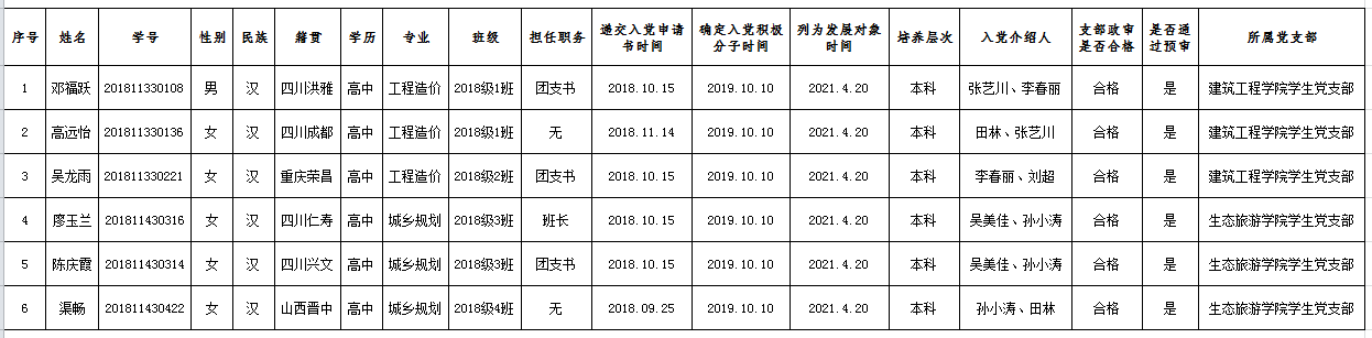 根据《中共四川文理学院委员会发展党员工作实施细则(修订)》的要求,建筑.旅游学院学生党支部拟于近期将以下6名发展对象吸纳为中共预备党员,现将邓福跃等6名发展对象相关情况予以公示。如有异议请以电话或邮件的方式实名向学院学生党支部反映。反映情况实事求是,客观公正,并提供联系方式,以便核实反馈。联系人:邓老师18284631319;  103281839@qq.com     张老师13990138619;   790865014@qq.com