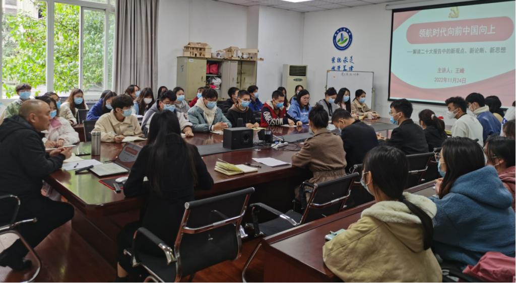 11月24日中午,学院党总支书记王峰在博文楼120A会议室为学生党支部党员作题为“领航时代向前中国向上”的党课讲座,讲座对党的二十大报告中的新观点、新论断、新思想进行了宣讲和解读。学院专职辅导员,学生党员、预备党员、发展对象和马列部全体同学参加会议,会议由明巧老师主持。