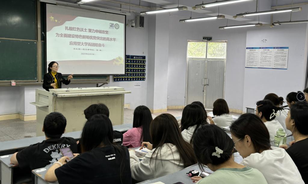 6月4日中午,学院学生第一党支部书记田林在博文楼125教室以“扎根红色沃土 聚力申硕攻坚 为全面建设特色鲜明优势突出的高水平应用型大学而团结奋斗”为题宣讲学校第二次党代会精神,学生党支部全体党员到场聆听党课。