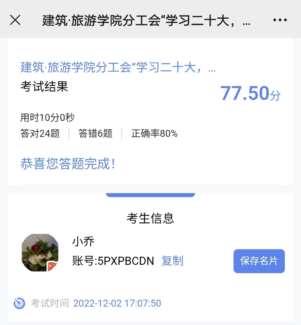为深入学习贯彻党的二十大精神,提高学院分工会会员政治觉悟、政治意识,加强思想建设,激发爱党爱国热情,巩固拓展党的二十大精神学习教育成果。12月2日,我院分工会开展了以“学习二十大,奋进新征程”为主题的党的二十大精神知识学习竞赛活动。