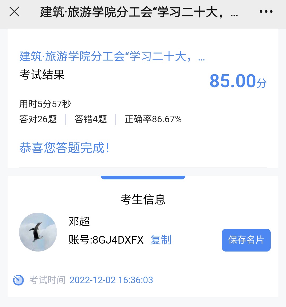 本次比赛采用为期1天线上答题形式,知识竞赛主要围绕党的二十大报告内容,延伸了中国共产党党史、党的十九大和十九届历次全会精神、习近平总书记重要讲话和重要指示批示精神等多个知识点。答题时,老师们冷静分析、认真思考、从容应答,充分展示了学院教职工扎实的知识储备和昂扬向上、奋勇争先的精神面貌。