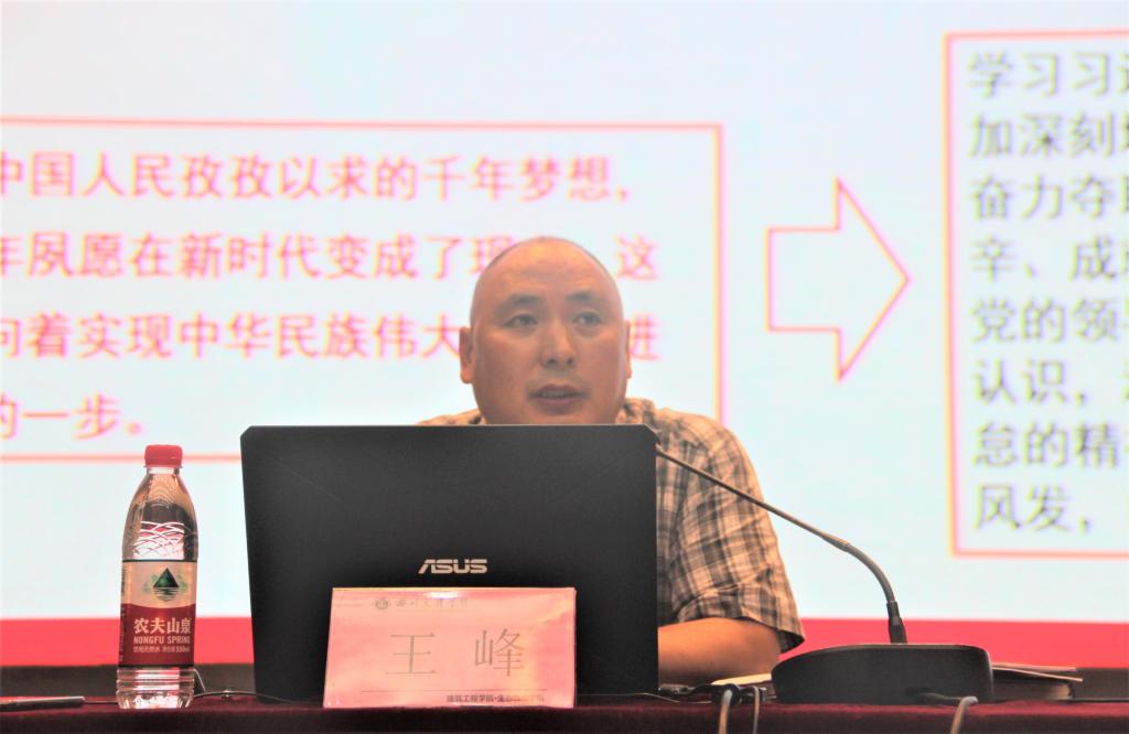 2021年9月17日晚,学院党总支书记王峰在艺术传媒大楼多功能厅为2021级新生作题为“百年历史铸辉煌,砥砺初心向复兴”—-学习贯彻习近平总书记“七一”重要讲话精神的入学理想信念教育讲座,明巧老师主持讲座。