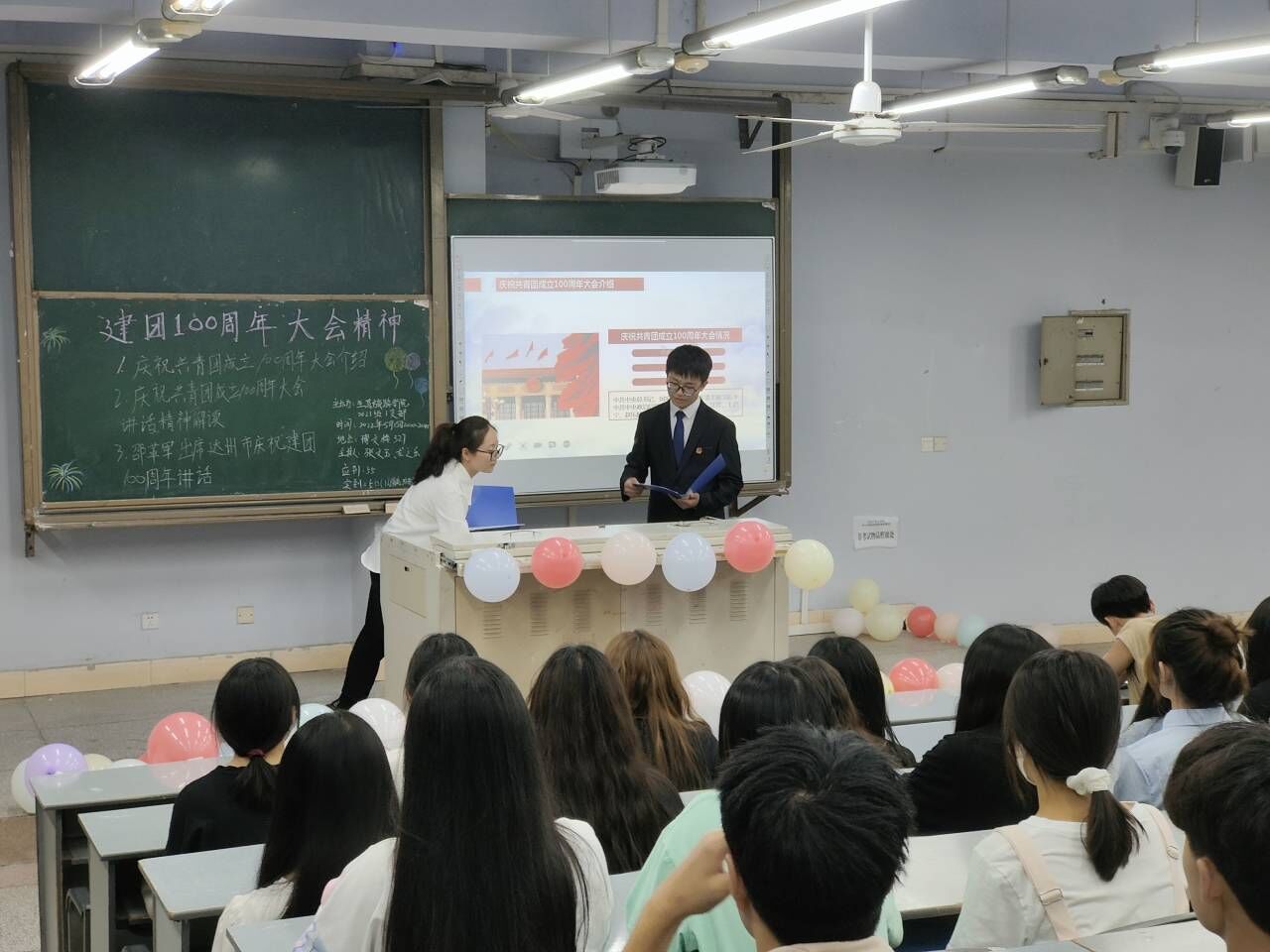 活动伊始,全体团员起立,奏唱《国歌》和《团歌》。随后,郭婵影介绍本次团日活动的主题,活动主要包括:学习中国共青团的发展历程、观看学习视频、团员发表感想三项内容。