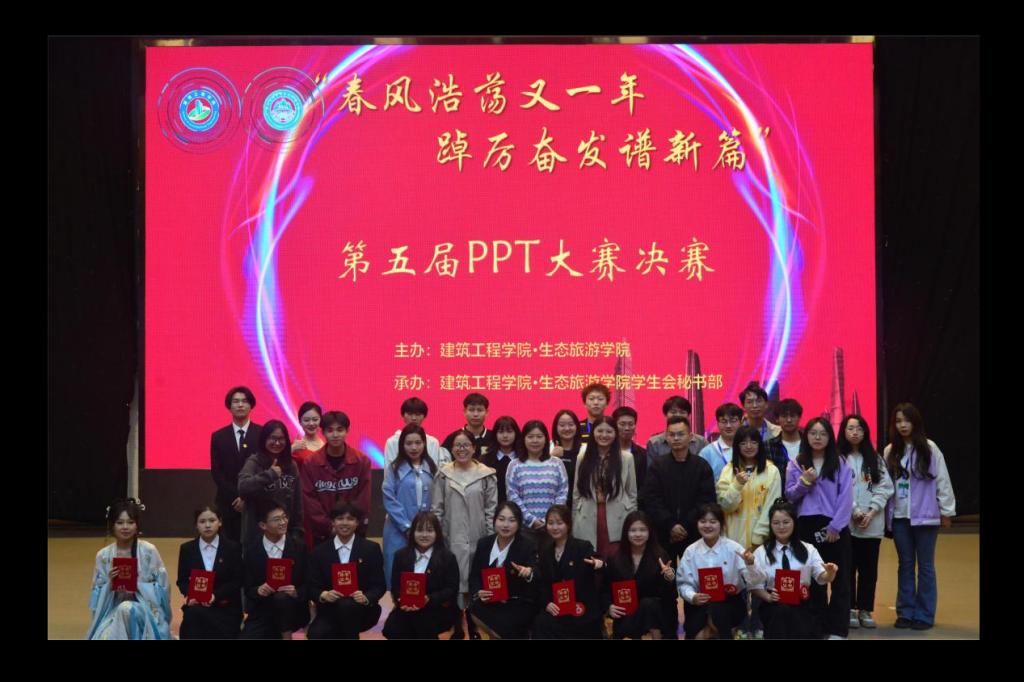 最后,在主持人公布所有参赛选手的得分并宣读获奖名单后进行颁奖。至此,“春风浩荡又一年·踔厉奋发谱新篇”——建筑旅游学院第五届PPT大赛决赛在同学们的欢声笑语中画上圆满的句号。