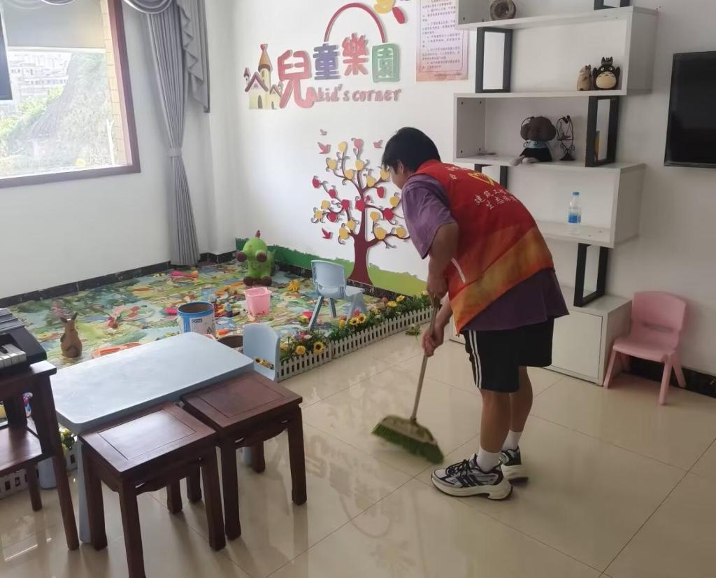 另一部分志愿者则拿着抹布,认真擦拭桌椅、门窗及各类生活设施。他们反复擦拭桌面、柜子,细致清理玻璃上的污渍,用清水和清洁剂去除顽固灰尘,使各类设施焕然一新,为残障人士营造出更加舒适干净的生活空间。