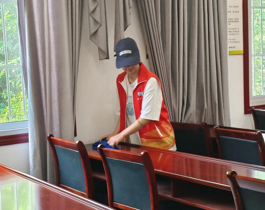 抵达社区后,志愿者们迅速分组,各司其职投入社区服务。在办公室内,一部分志愿者手持扫帚与簸箕,弯腰俯身仔细地清扫地面。他们从办公桌到墙角边,不放过任何藏污纳垢之处,力求清除每一粒灰尘,让社区环境变得整洁敞亮。