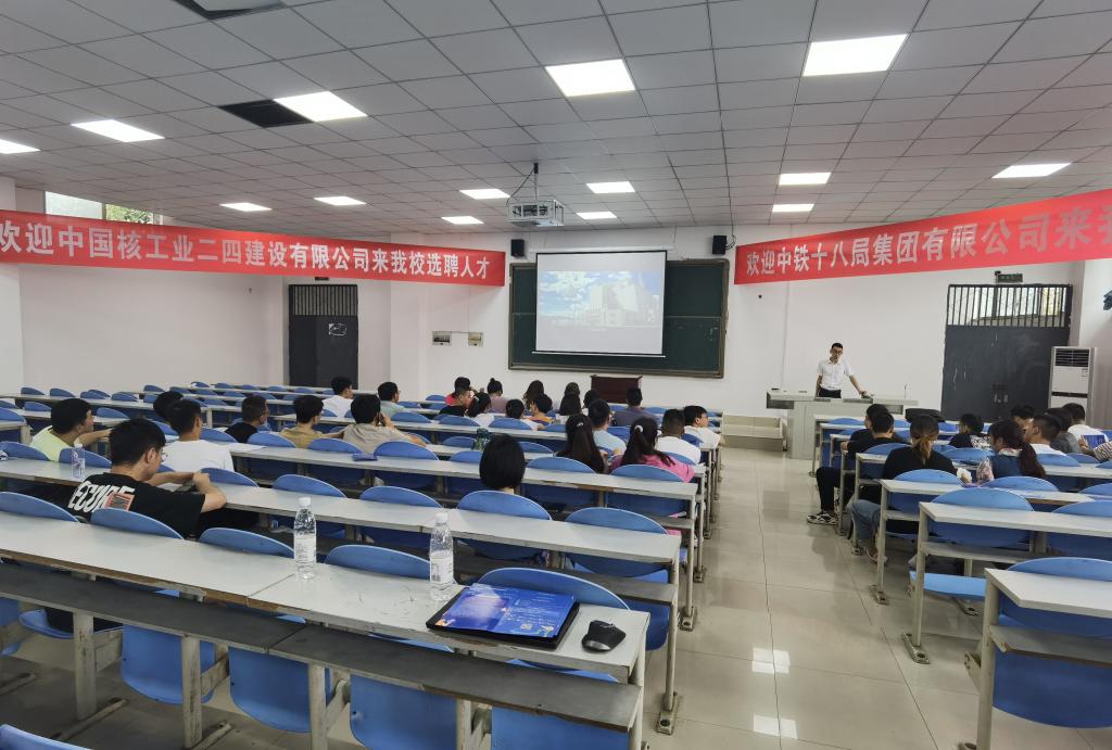 为持续助推我院学生就业,在第一场招聘会签约状态良好之际,2021年9月23日上午,我院携手中国核工业二四建设有限公司、中铁十八局集团有限公司共同举办十大买球的正规网站秋季第二场专场招聘会。副院长熊勇权赴产教融合基地现场主持招聘会。