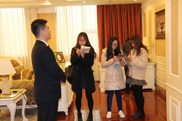 接着冉杰经理分批次带领同学们参观客房部,并介绍酒店拥有豪华套房、普通套房、标准间,单人间等各类型客房共计141间。客房服务设施完备,干净整洁。