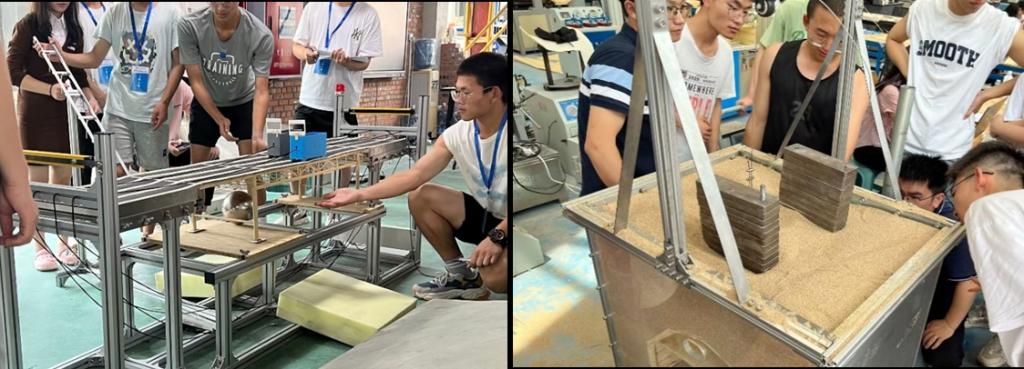 本次比赛共有16支队伍参加,分为结构组和岩土组。结构组赛题为《撞击荷载下变参数两跨四车道桥梁结构设计与制作》,通过设计一座两跨桥梁并进行移动车辆和撞击荷载的加载来考察桥梁结构的安全性和稳定性。岩土组赛题为《隧道结构模型设计》,设计一个上部为人行通道的隧道结构,并进行隧道顶部堆载和动载作用下的加载测试。本次比赛为期两天,主要分为模型制作和加载测试两部分,评委根据方案设计、模型设计与制作质量、陈述与答辩、加载测试四个环节进行评分。最终评选出最佳创意奖1名、一等奖3名、二等奖5名、三等奖5名以及优秀奖若干。