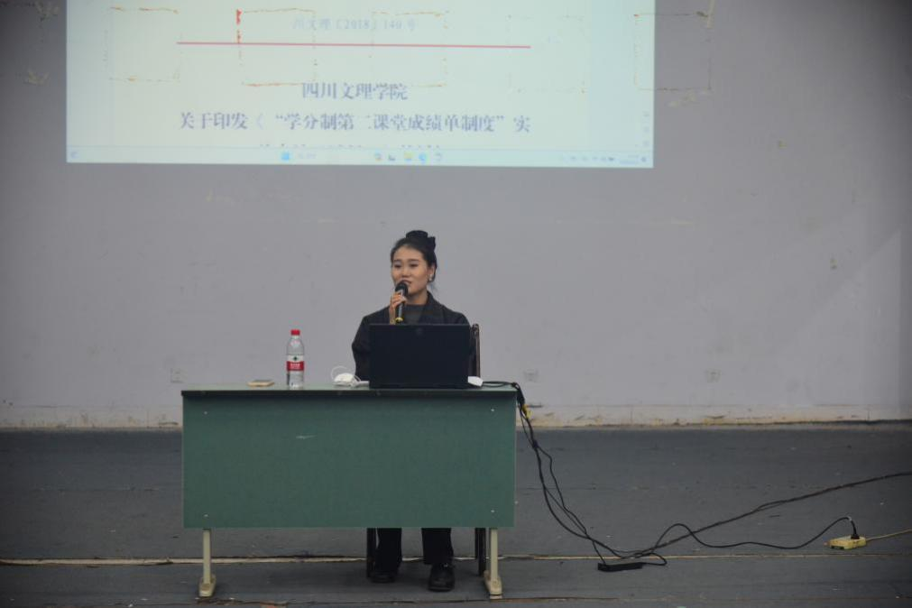 欧文雨为学生讲解了两个方面的问题:勤俭节约教育和第二课堂制度宣讲。欧文雨通过自己的亲身经历和身边案例呼吁同学们勤俭节约从小事做起,详细讲解了第二课堂的积分和学分如何获取及认定方法。