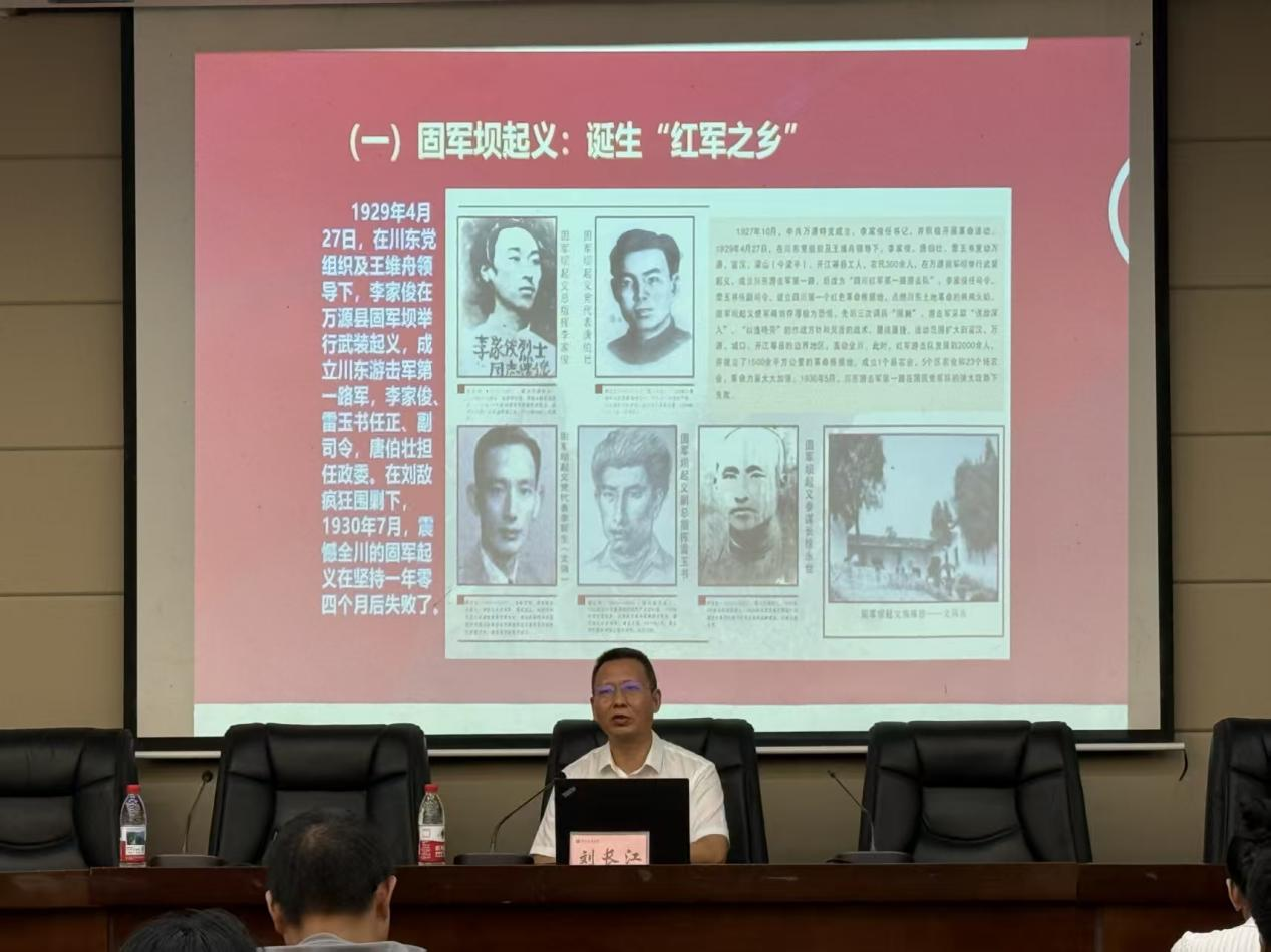 讲座中,刘长江以《川陕苏区时期党对青年的感召培养及其当代启示》为题,围绕川陕苏区历史展开深入讲解。他从党对青年的感召与培养路径切入,系统阐述了川陕苏区时期党结合革命实际需求,为青年成长搭建平台、明确方向的实践历程;通过鲜活史料还原了党以理想信念引领、以实践锻炼赋能、以组织关怀凝聚等感召青年的有效方式;深入剖析了该时期党感召青年工作中“扎根群众、靶向发力、知行合一”的鲜明特点;并结合史实展示了青年群体在苏区建设、革命斗争中展现的担当作为与卓越成效。