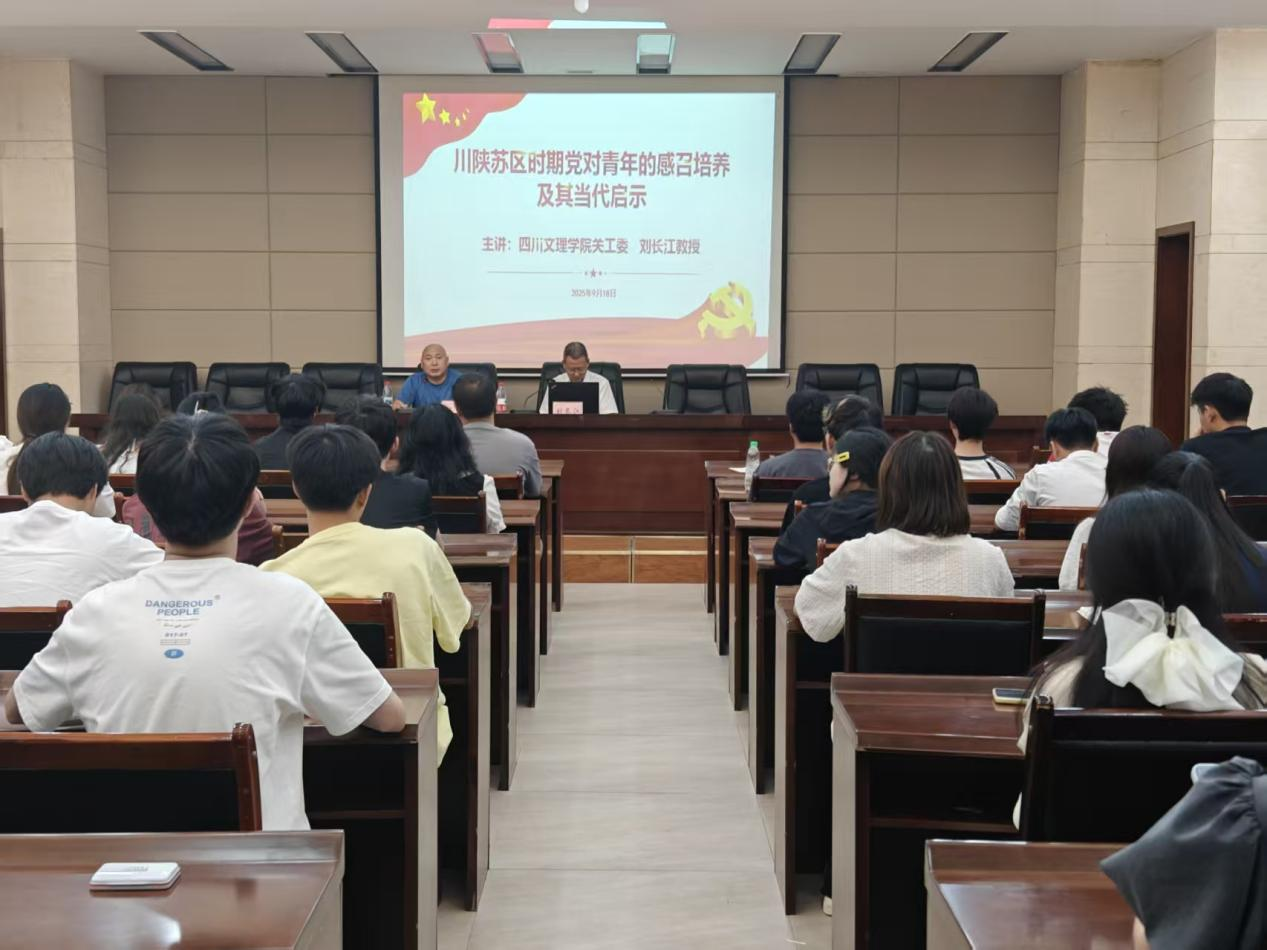 9月18日下午,学院学生第一、第二党支部以“纪念中国人民抗日战争暨世界反法西斯战争胜利80周年”为主题开展9月党日活动,旨在引导两个党支部的青年学子铭记历史、缅怀先烈、珍爱和平、开创未来。活动特别邀请四川文理学院关工委刘长江教授作专题讲座,由学校离退休工作处党总支书记王峰主持,学生第一、第二党支部全体党员师生、部分入党积极分子参加。全体参会人员齐聚一堂,在红色历史回望中汲取精神养分。