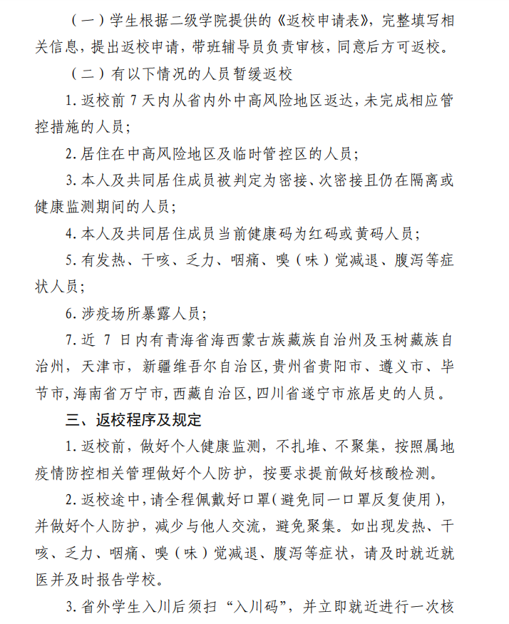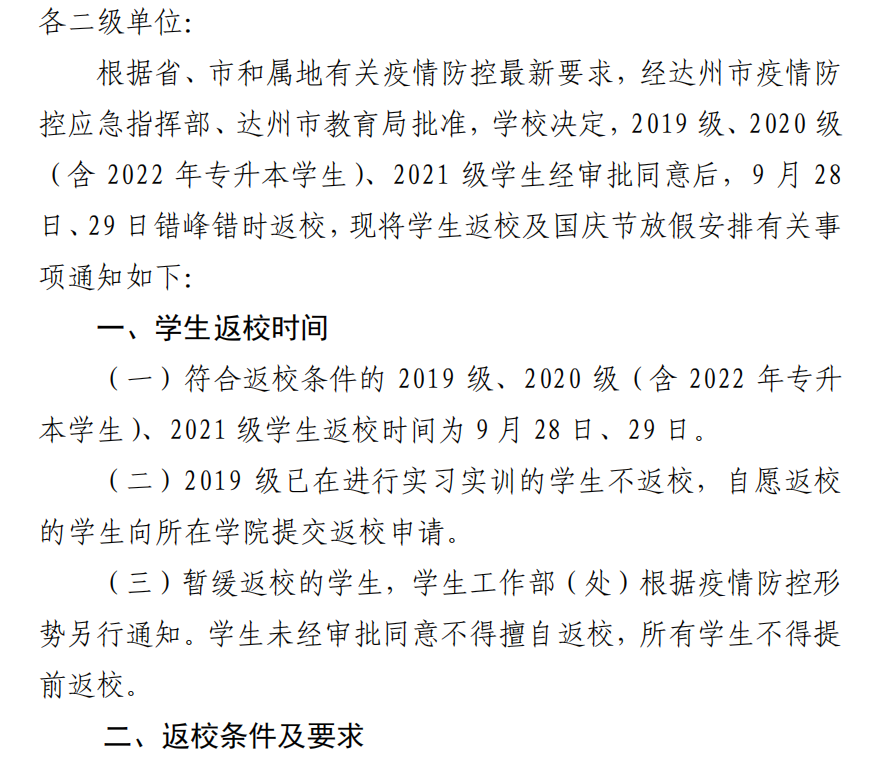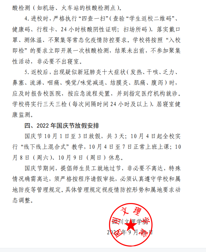 四川文理学院关于2022 年秋季学期学生返校及国庆节放假安排的通知