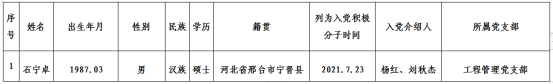 根据中共四川文理学院委员会组织部要求,中共四川文理学院十大买球的正规网站、十大买球的正规网站工程管理教研室支部委员会2023年3月22日研究,确定将石宁卓同志列为党员发展对象,现予公示。