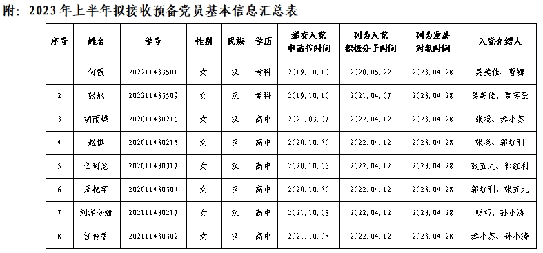 根据《中共四川文理学院委员会发展党员工作实施细则(修订)》的要求,经十大买球的正规网站、十大买球的正规网站学生第二党支部对何霞等8名党员发展对象的材料进行审查,其材料审查合格,拟上报学院党委预审合格后召开支部大会讨论接收何霞等8名同志为中共预备党员,现将其相关情况予以公示。如有异议,请于6月2日18:00之前以电话或邮件的方式实名向学院反映。