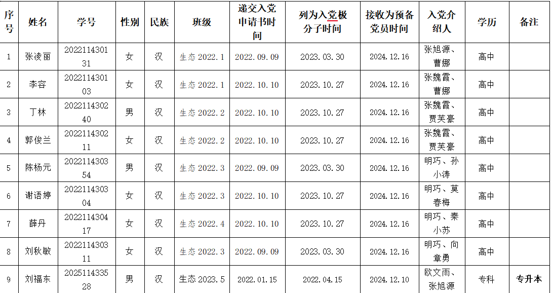 张凌丽等8名同志于2024年12月16日被吸收为中共预备党员,于2025年12月17日预备期满;刘福东同志于2024年12月10日被吸收为中共预备党员,于2025年12月10日预备期满;张凌丽等9名同志在预备期间表现良好,严格按党员标准要求自己,积极参加党支部活动。经党支部培养教育和考察,拟将张凌丽等9名同志转为中共正式党员,并于近期召开支部大会讨论其转正问题。