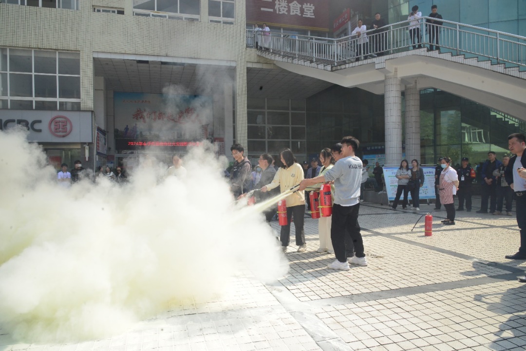 在集合地点的消防员同志向在场师生普及了灭火器的正确操作步骤和使用方法,并强调了一般性火灾的施救措施,接着,部分师生代表陆续操作灭火器进行了现场模拟灭火演练。