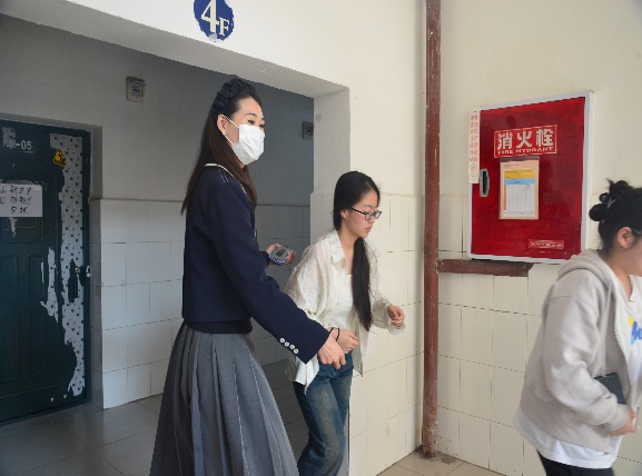 演练开始,学生宿舍楼两侧安全出口处提前安放的烟雾弹被拉开,随即火警铃响起,同学们迅速、有序地按照预先设计的消防逃生路线安全疏散。过程中,同学们用在校所学到的火灾逃生技巧,用湿毛巾捂住口鼻,靠着墙低着腰,穿过弥漫浓烟的楼道,在专职辅导员田林和欧文雨的带领下迅速有序到达指定集结地点。