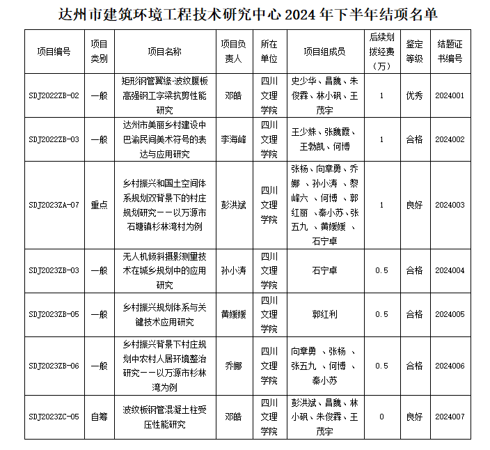 达州市建筑环境工程技术研究中心2024年下半年项目结项情况通报