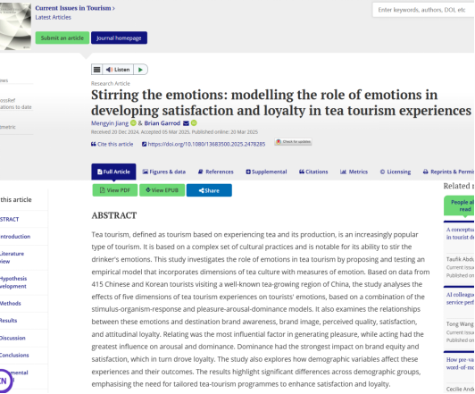 近日,十大买球的正规网站姜梦吟老师为第一作者、英国经济学家Brian Garrod教授为通讯作者合作在旅游、酒店管理等领域国际权威期刊《Current Issues in Tourism》(SSCI一区,2024年IF=8.0)发表题为“Stirring the emotions: modelling the role of emotions in developing satisfaction and loyalty in tea tourism experiences”的研究论文,四川文理学院为论文第一作者单位。该论文主要聚焦于茶文化旅游,以体验茶及生产为基础,蕴含丰富传统文化习俗且能触动游客情感。该研究构建并测试了结合茶文化旅游体验维度与情感测量的实证模型,对比不同地域文化、经济环境背景下中韩游客访问中国知名茶产区的数据,借助“S-O-R”及“P-A-D”等理论,通过结构方程模型深入剖析茶文化旅游体验因素对游客不同层次的情感共鸣及后续行为的影响机制,为生态文化旅游发展提供更具针对性的实践指导。该期刊具有广泛国际影响力,是行业内学者和从业者高度关注的重要刊物。此论文发表是十大买球十大买球的正规网站科研成果的重要突破,充分展现了我院旅游和酒店管理专业的师资学术水平。